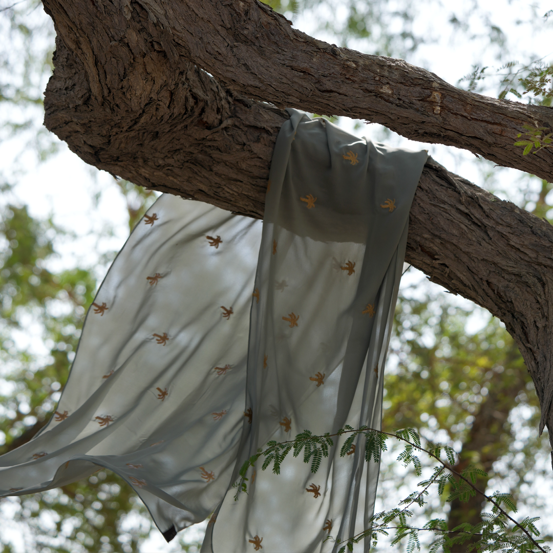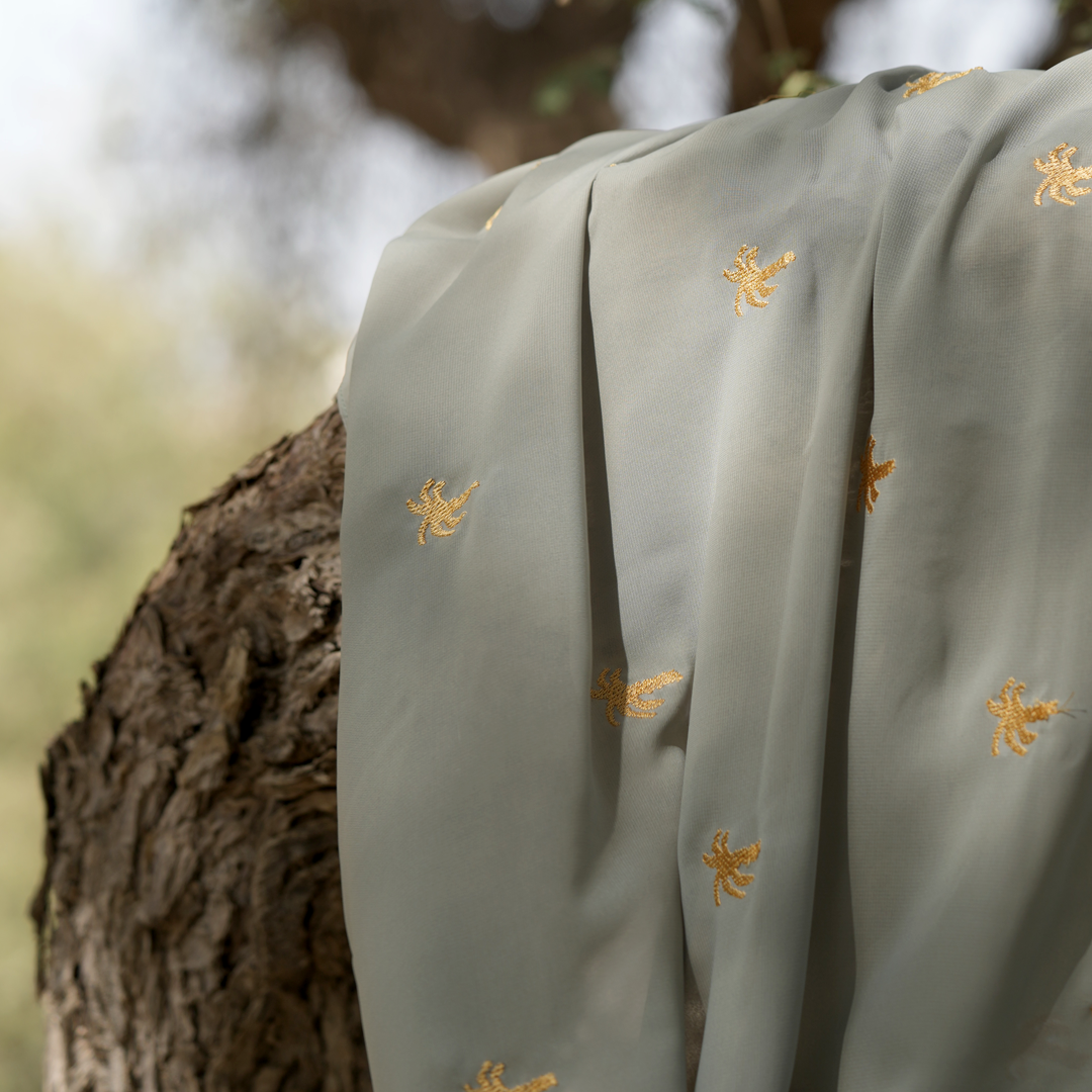A soft pastel green sheila embroidered with the iconic UAE palm — a symbol of generosity, resilience, and roots. Crafted from airy chiffon that flows with every step, this piece brings a gentle touch of heritage to a modern silhouette.