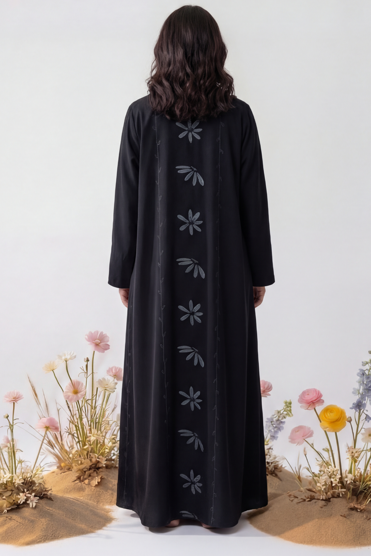 Custom abaya with a hand-painted Nuweer floral print