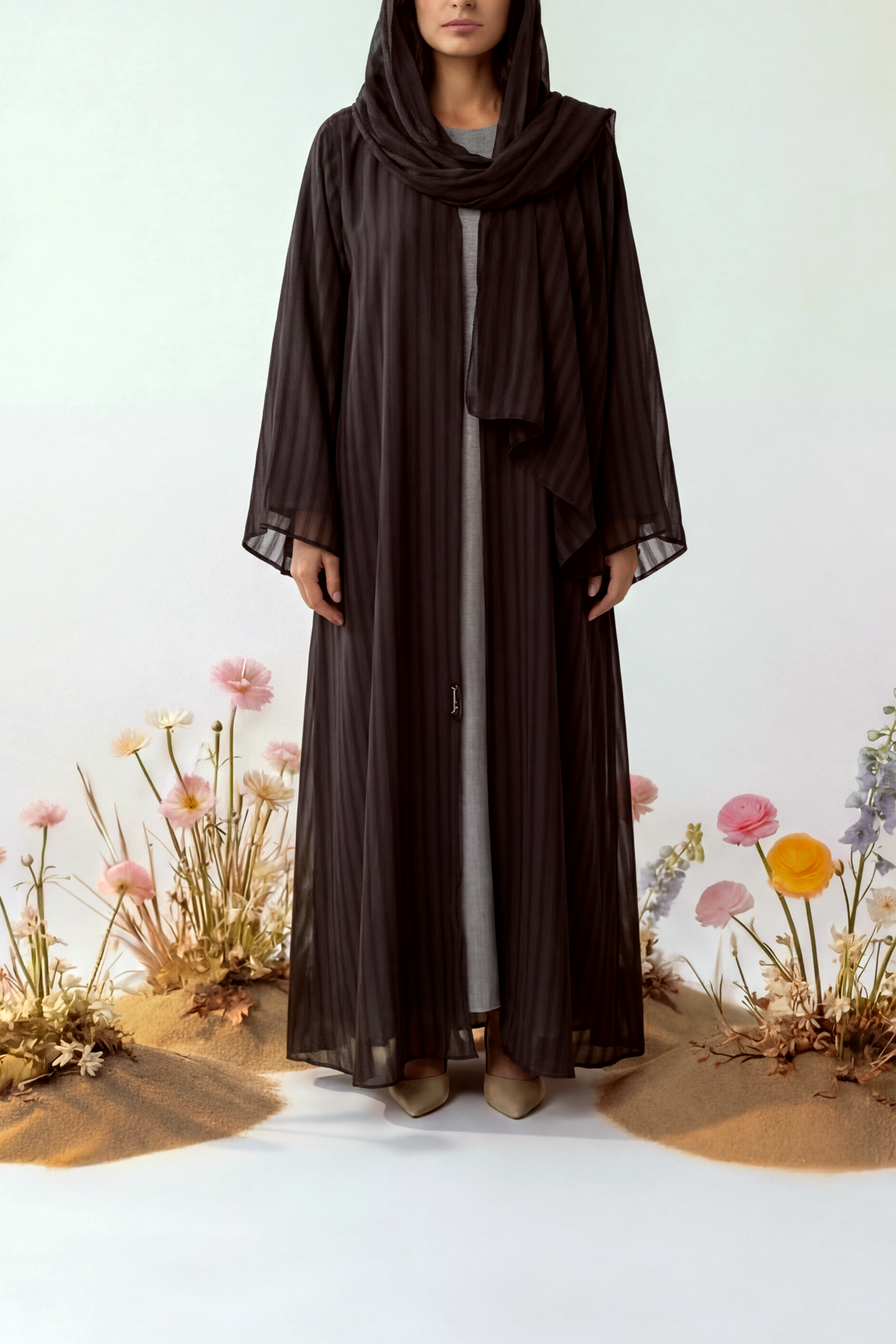 Korean chiffon abaya with mixed-density stripes for subtle texture.