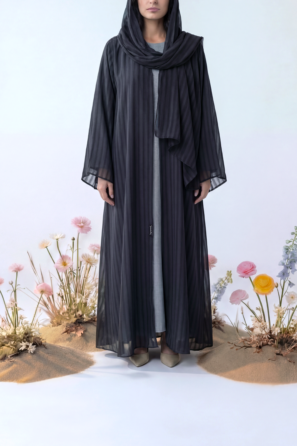 Korean chiffon abaya with mixed-density stripes for subtle texture.